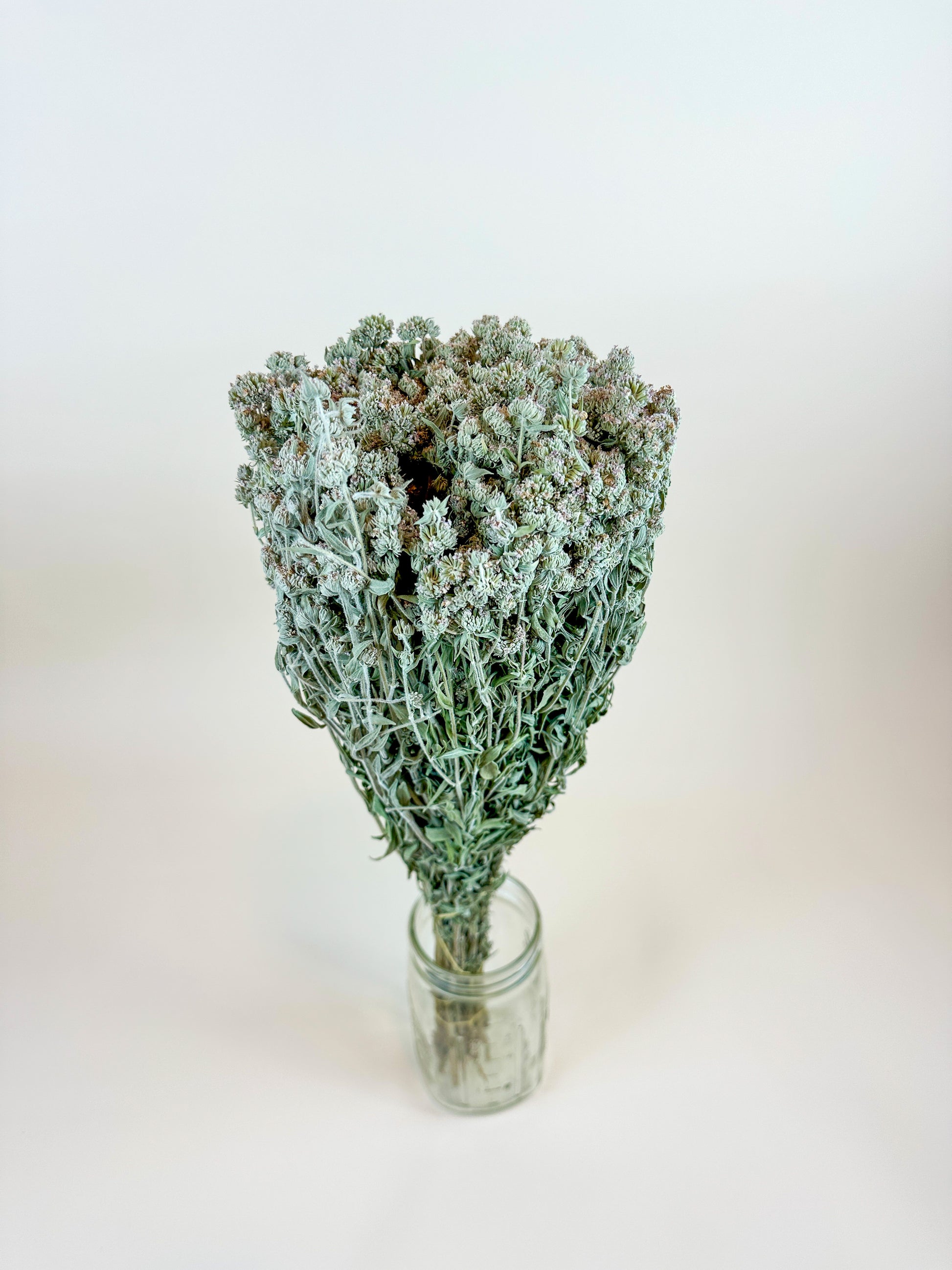 Mountain Mint is a long, bushy herb with rich dark green foliage and a refreshing natural minty aroma. With its dense texture and small clustered leaves, it’s a favorite for use as a filler in dried floral arrangements, wreath bases, or herbal-inspired decor. Its wild, natural form adds structure and fragrance to rustic, seasonal, and cottagecore designs.