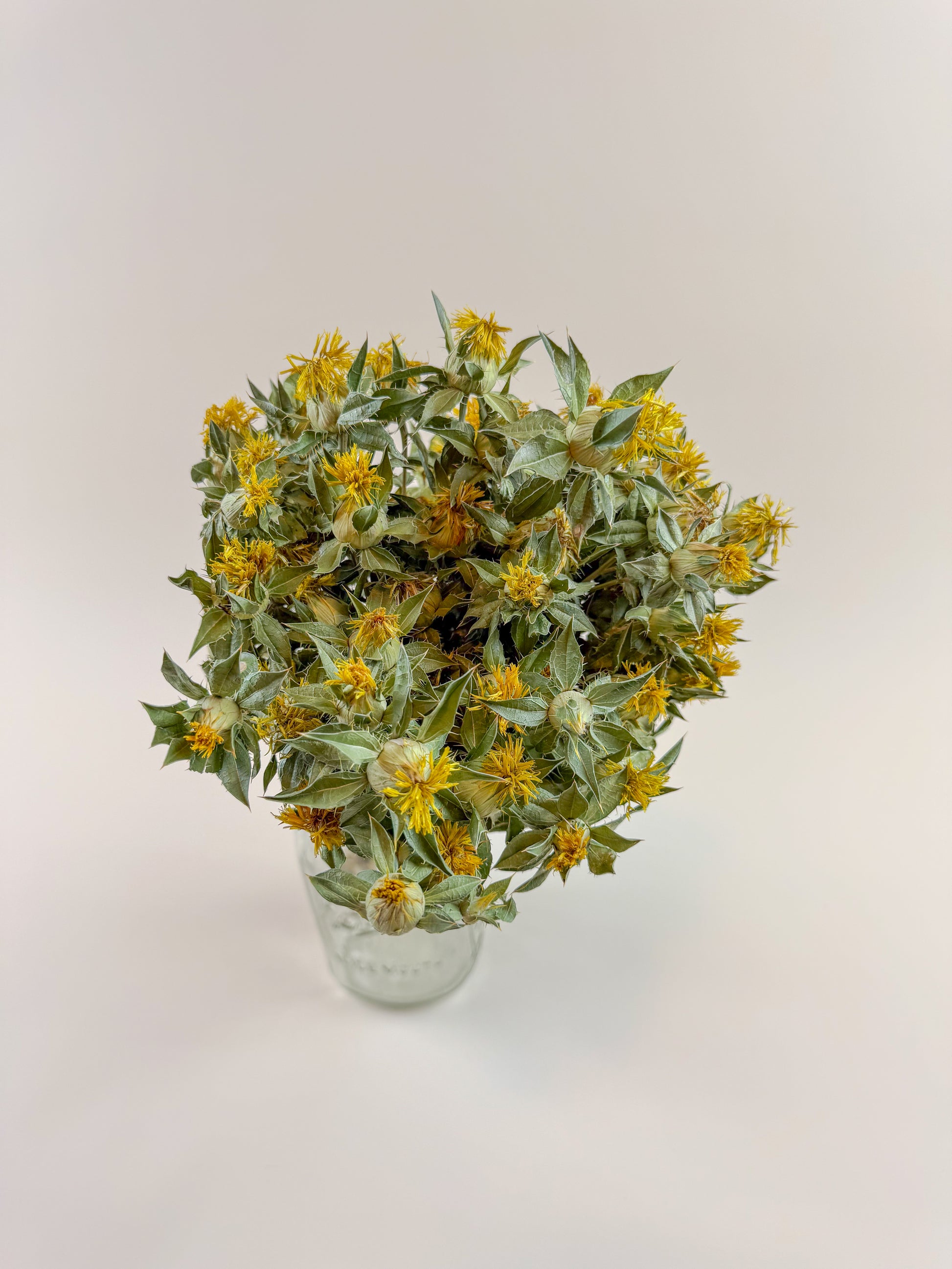 Yellow Safflower features tall, sturdy stems topped with vibrant globular flower heads in yellow. With its olive green, thistle-like stems and abundant leaves, this bold botanical adds rustic texture and striking color to dried floral arrangements, wreaths, bouquets, and natural decor.