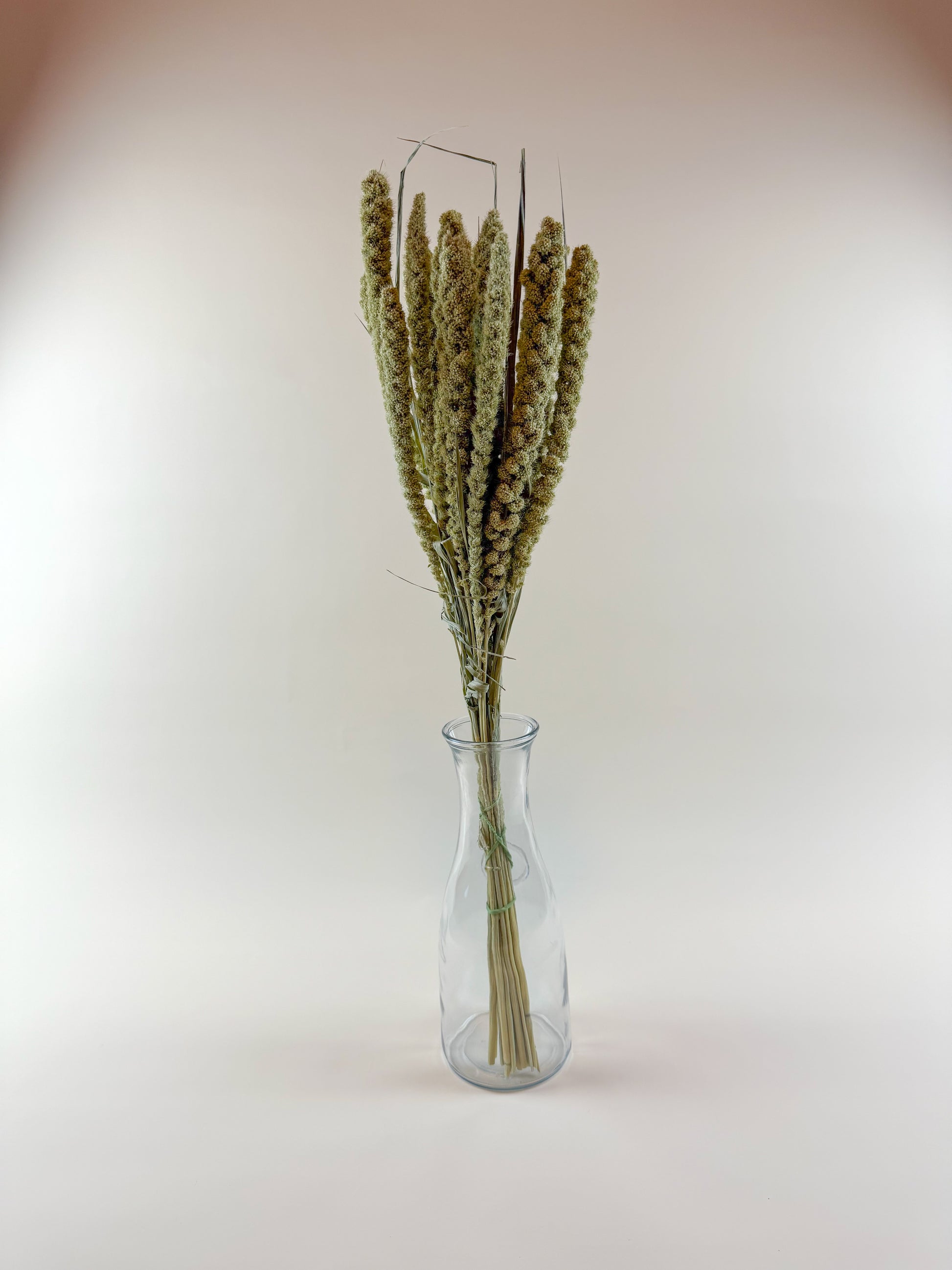 Our Spray Millet features a full bunch of golden-green seed pod heads on sturdy stems, perfect for adding natural texture and warm color to dried floral arrangements, wreaths, and rustic décor. Carefully air-dried with no added preservatives or coloring, this millet maintains its vibrant green tones and structural integrity for years, especially when displayed out of direct sunlight.